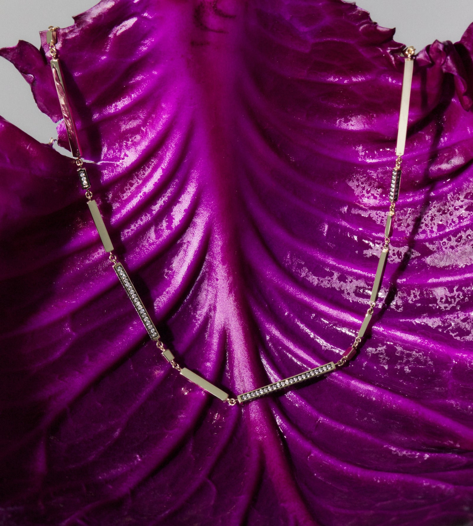 The Harkness version of a gold chain. Absentmindedly daydreaming during a conversation at a family dinner. Finding some discarded matchsticks left on the table and armed with the task of creating a perfect circle out of them. The inspiration for this necklace was born. Crafted in recycled yellow gold, it features 195 natural, round diamonds (1.950cts). Each diamond bar is set with stones on all four sides, meticulously designed to sparkle with every movement of the body.