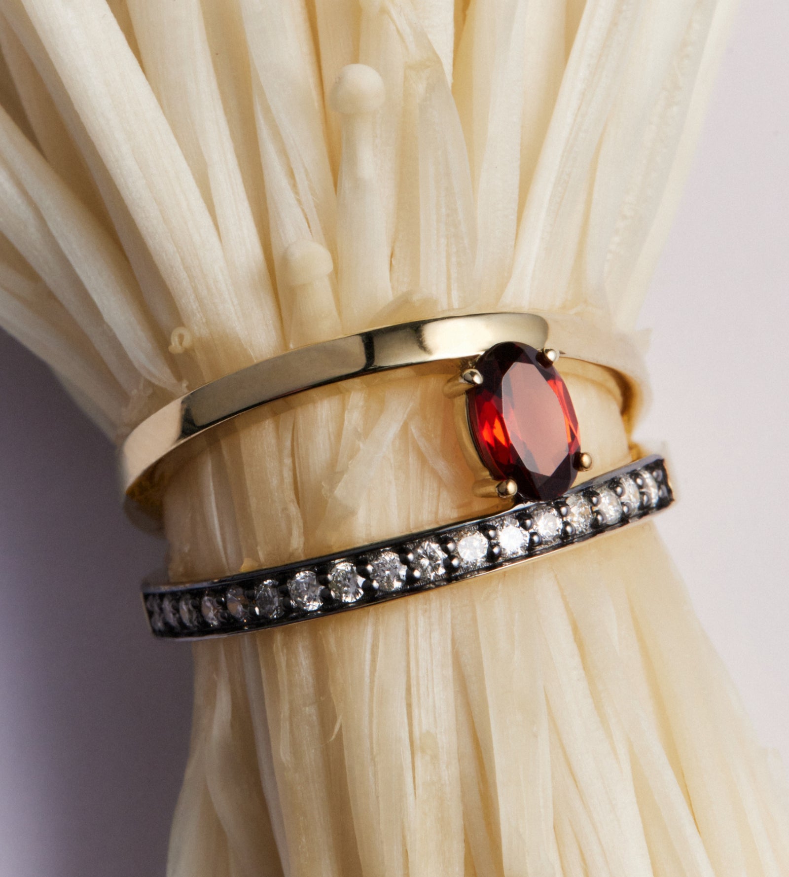 Inspired by nature's asymmetry, be reminded that not everything must be centered, straight or linear. Expressed in recycled solid gold, 17 round, natural diamonds (0.22cts) and a hero oval-shaped, natural garnet (0.585cts) placed off-centre to hint at a gentle rebellion against conformity.