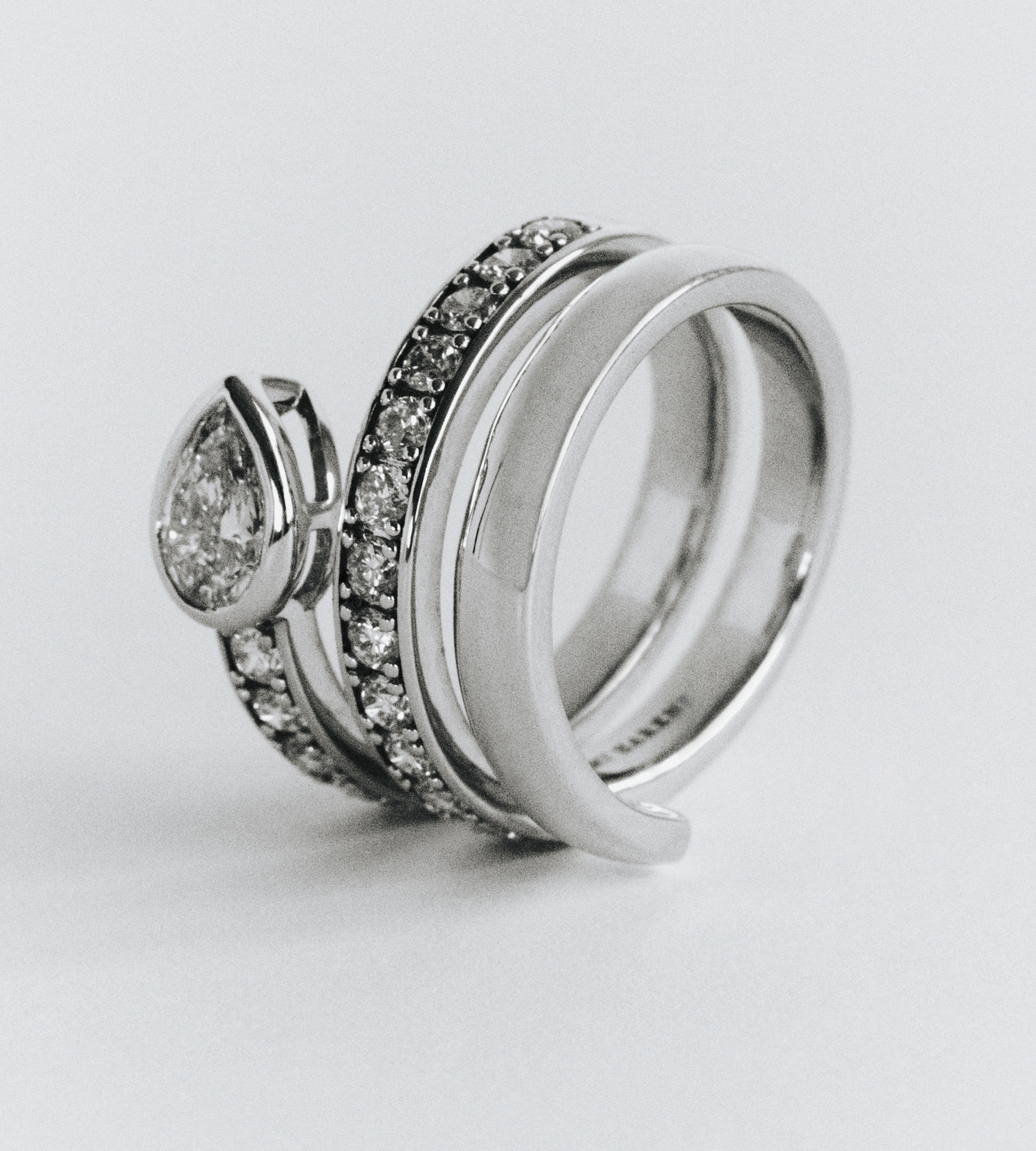 A coiled band set with 18 round diamonds (0.60cts), finished with a bezel-set pear diamond (0.50cts). Designed to wrap around the finger, this ring draws inspiration from the vintage serpent ring, reinterpreted with a modern, casual feel. Intended as a pinky ring and constructed for comfort and longevity, while remaining timeless and elevated. Crafted in recycled gold.
