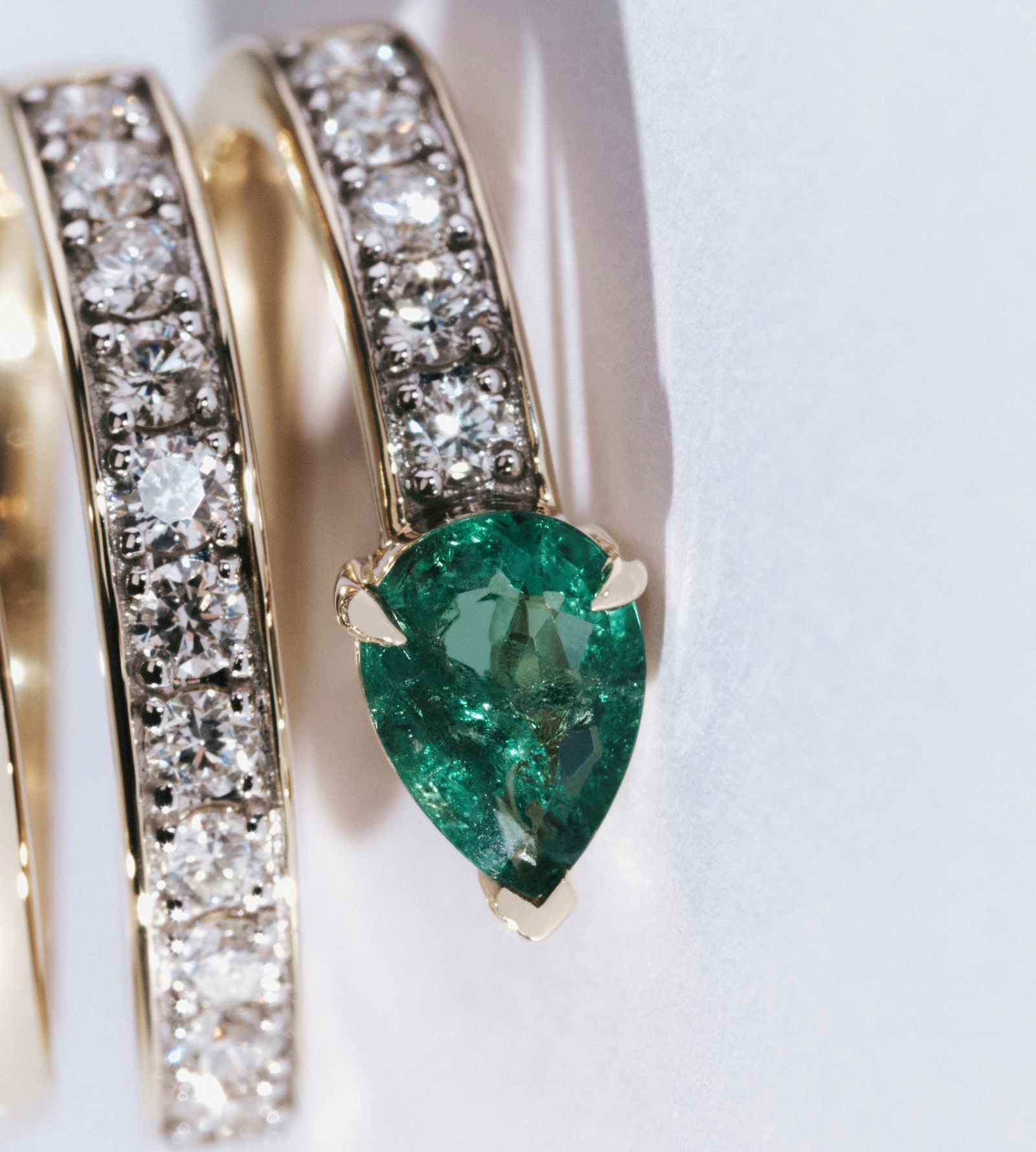 A coiled band set with 18 round diamonds (0.60cts), finished with a claw-set pear emerald (0.60cts). Designed to wrap around the finger, this ring draws inspiration from the vintage serpent ring, reinterpreted with a modern, casual feel. Intended as a pinky ring and constructed for comfort and longevity, while remaining timeless and elevated. Crafted in recycled gold.